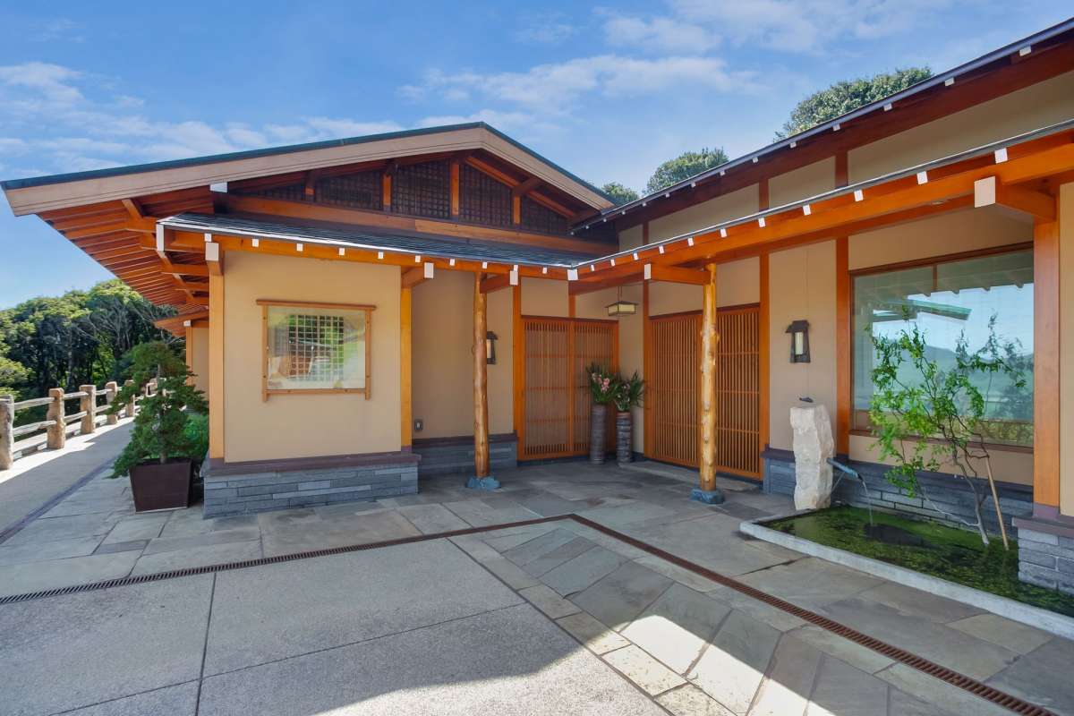 The sprawling grounds include formal Japanese gardens and Koi ponds, as well as a swimming pool and bocce ball court.